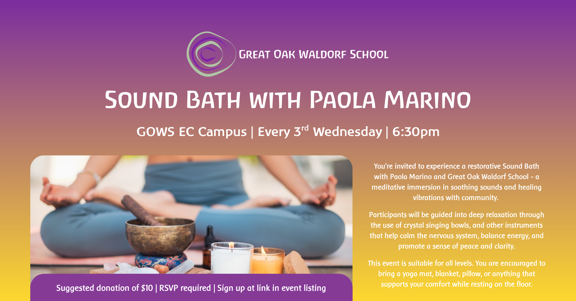 We are happy to be partnering with Paola Marino, owner of Bliss Yoga, to bring this monthly offering to our community, every third Wednesday beginning Nov. 19th, at 6:30pm on the Early Childhood Campus in the Wildflower Garden classroom.