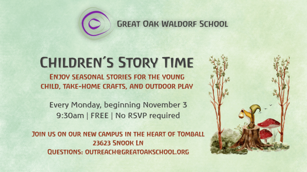 Join Ms. Taylor, our Parent-Child teacher, every Monday while school is in session at 9:30am for our free Children’s Story Time. Enjoy seasonal stories for the young child, take-home crafts, and outdoor play time on our new campus, located in the heart of Tomball. Free and open to the public – no RSVP is required! Questions? Send us an email at outreach@greatoakschool.org